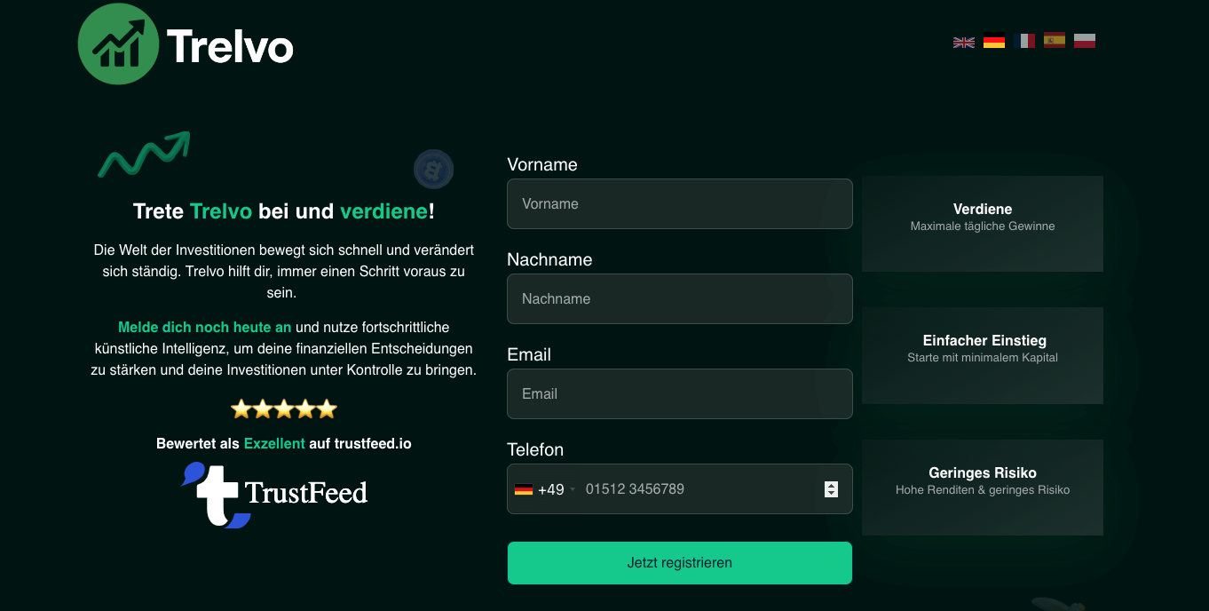 Trelvo bietet zahlreiche Optionen für Geschäfte und sicheres Abheben von Geld. Händler können die besten verfügbaren Tools und Funktionen für die Verwaltung ihrer Handelsportfolios nutzen, da es sich von anderen Handelsrobotern auf dem Markt abhebt. Es gibt viele verschiedene Zahlungsmethoden auf der Plattform, einschließlich Banküberweisung, Maestro, Master Card und mehr. Händler können die Methode auswählen, mit der sie mit der Einzahlung auf die Plattform am besten vertraut sind. Trelvo Bewertung sorgt durch seinen Partner-Broker für die Sicherheit der persönlichen und finanziellen Daten der Händler. Darüber hinaus bewahrt der Händler die eingezahlten Beträge und der Broker auf verschiedenen Konten auf. Händler können sehen, dass der Händler sich während seiner Zeit auf der Plattform um sein Geld kümmert. Sie haben auch die Gewissheit, dass der Krypto-Handel sicher durchgeführt werden kann.